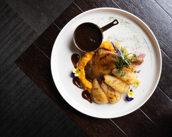 Slow-cooked Canter Valley duck leg, served over silky pumpkin mash accompanied by a glazed poached pear. Finished with a fragrant thyme jus for a perfect balance of savoury and sweet.