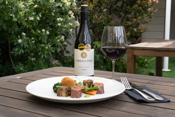A duo of Middlehurst Station lamb featuring tender lamb loin and a crisp shoulder croquette, served with Dunsinane’s Black Garlic agria potato gratin, Hanmer Springs Honey-roasted carrots, broccolini, pea purée, and garden mint, all finished with a rich pinot noir jus.