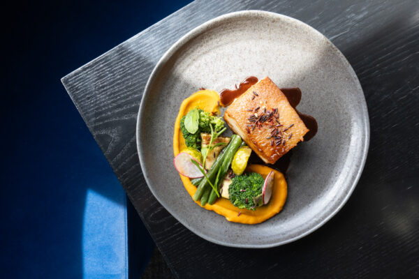 Harris Farms braised pork belly with a housemade ponzu glaze, served alongside nutmeg, sage & pumpkin purée, wild black puffed rice, caramelised apple & fennel and seasonal greens. (GF)